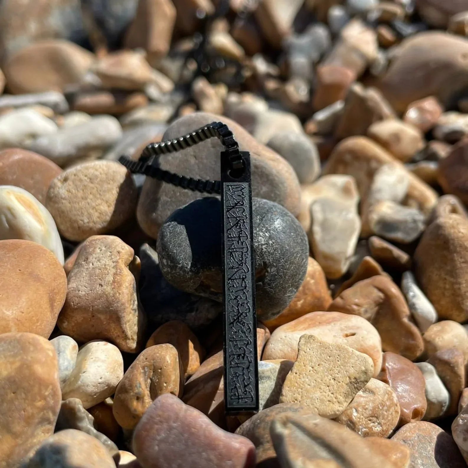 The pendant features Ayat al-Kursi (Surah Al-Baqarah, 2:255), one of the most powerful and revered verses in the Qur'an, known for its emphasis on the greatness, sovereignty, and protection of Allah.